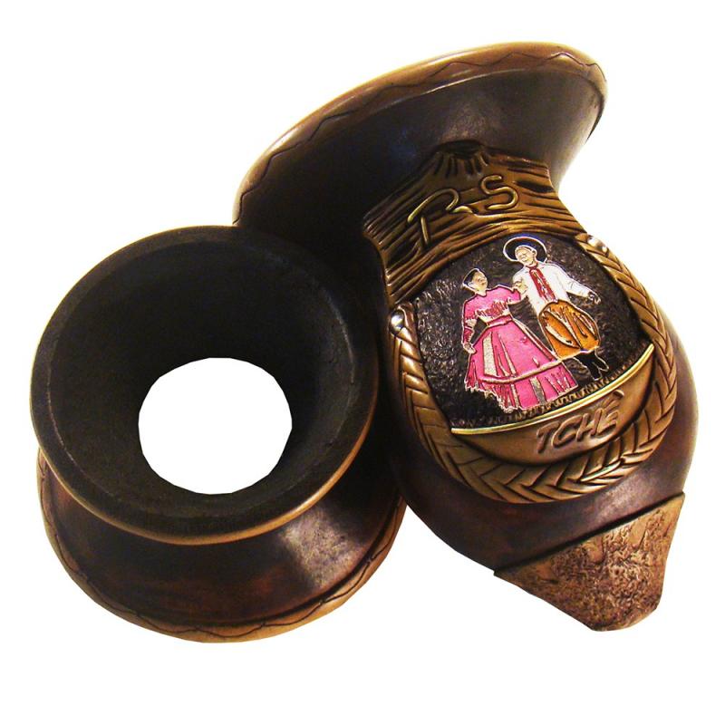 Cuia confeccionada em porongo, com suporte e detalhe casal gaúcho em metal. Por tratar de matéria prima natural, podem variar os tamanhos e tonalidade da cor.