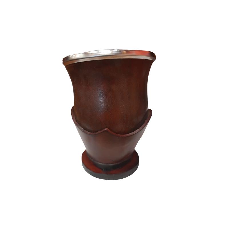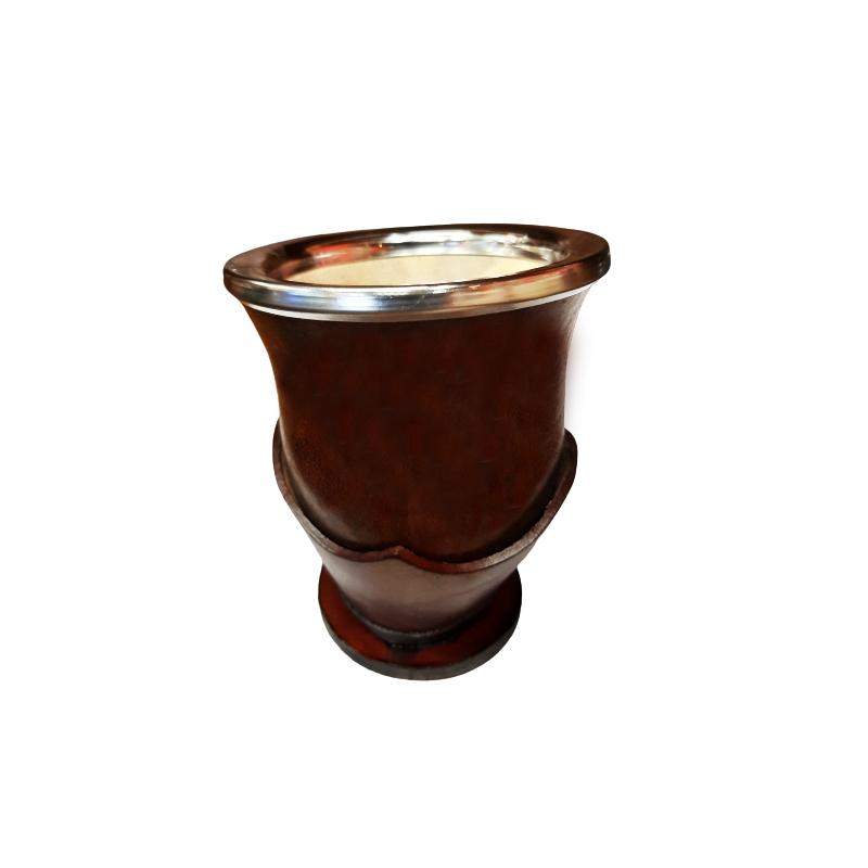 Cuia confeccionada em porongo com revestimento de couro e bocal de inox.