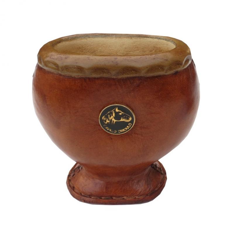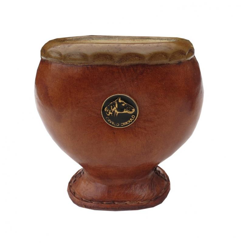 Cuia gajeta confeccionada em porongo, com pé e detalhe "cavalo crioulo" em metal. Por tratar de matéria prima natural, podem variar os tamanhos e tonalidade da cor.