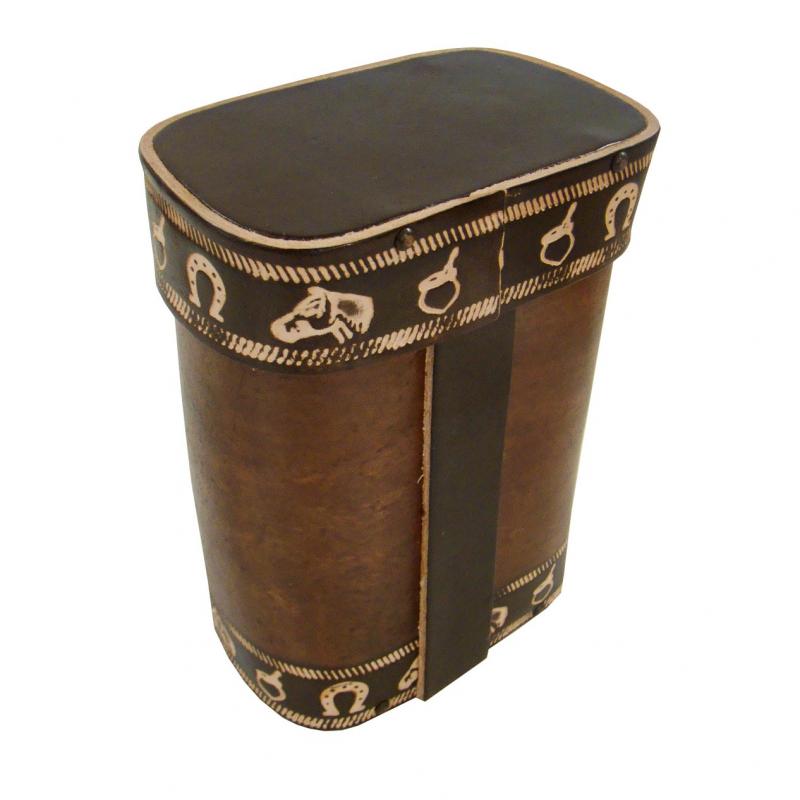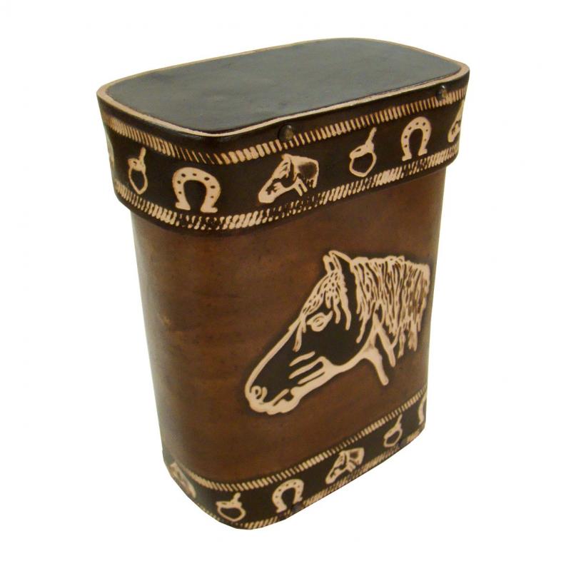 Porta erva confeccionado em couro, com capacidade para 1 Kg e detalhe "cavalo", medindo aproximadamente 19 cm de altura e 14,5 cm de largura e 8,5 cm de comprimento