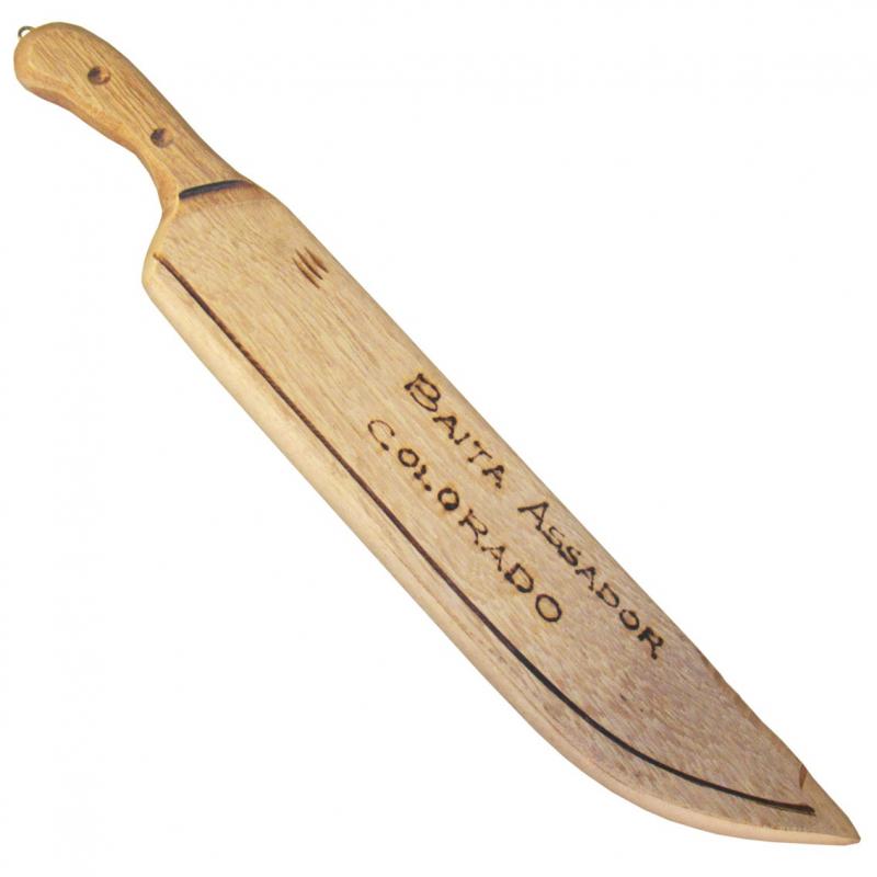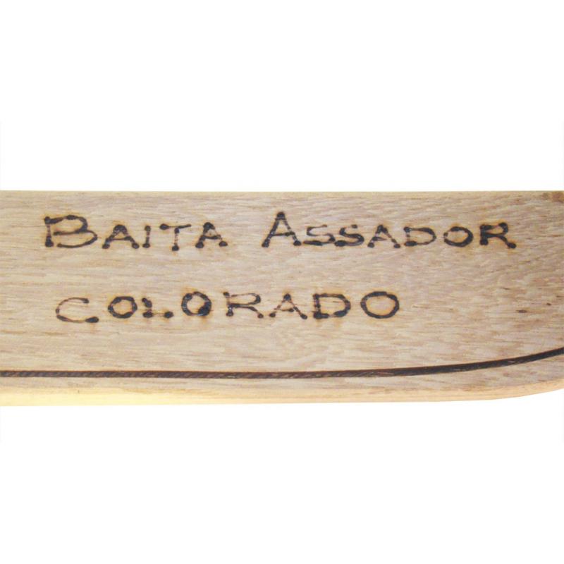 Batedor de sal confeccionado em madeira, com a escrita "baita assador colorado", pirografada.