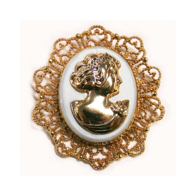 Este camafeu apresenta um tom dourado, proporcionando uma aparência luxuosa que imita o ouro, embora seja feito de materiais diferentes, sendo uma semi joia. Sua coloração dourada brilhante adiciona um toque de elegância e sofisticação a qualquer visual. Este camafeu em "tom de ouro" é uma opção acessível para quem deseja um visual requintado e brilhante.