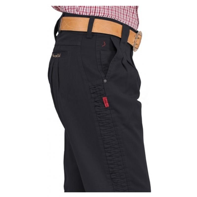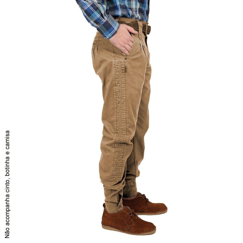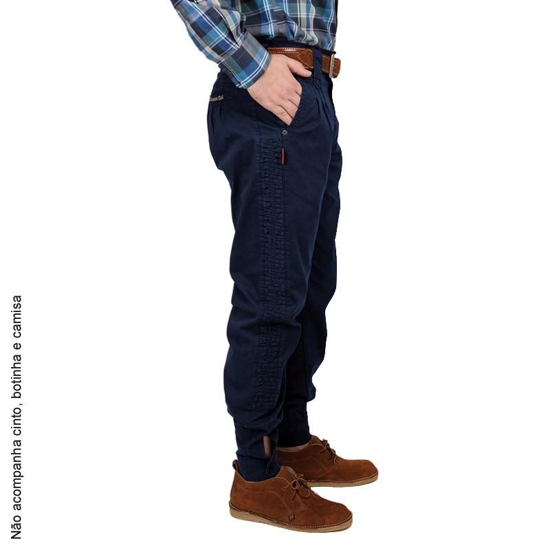 Bombacha masculina Pampa sul Brim com favos laterais confeccionada com tecido 100% algodão. Contempla passantes para cinto, um passante para guaiaca na parte de trás, bolsos funcionais na parte de trás, braguilha com fechamento em zíper e botão de metal, fechamento nos punhos com botão de massa.