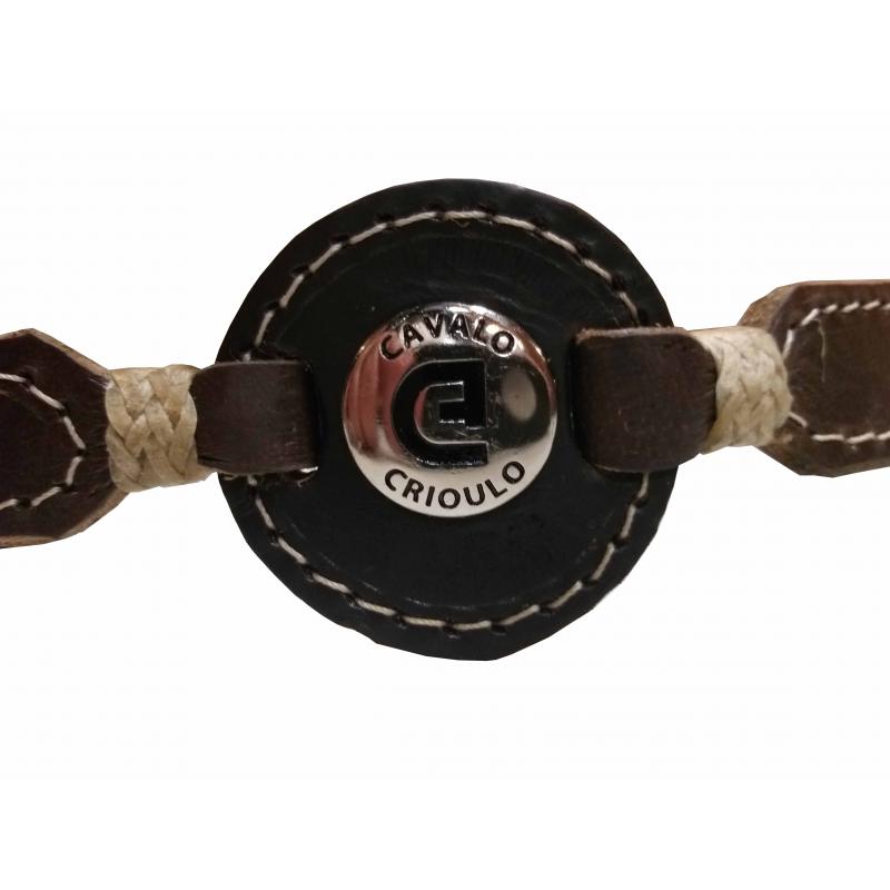 Peiteira confeccionada em couro com argolas de inox e detalhe em boton mapa brasão RS, com comprimento aproximado de 83 cm.